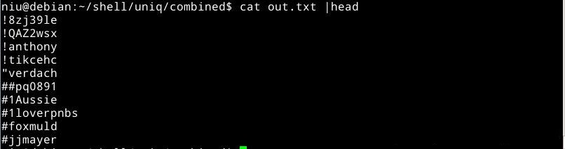 由于去重命令只支持经过sort排序后的文件,因此需要将out.txt进行sort排序,然后将其去重