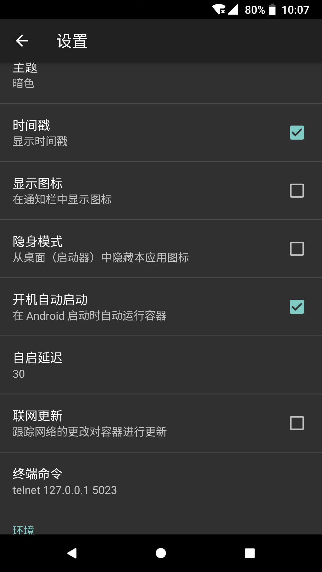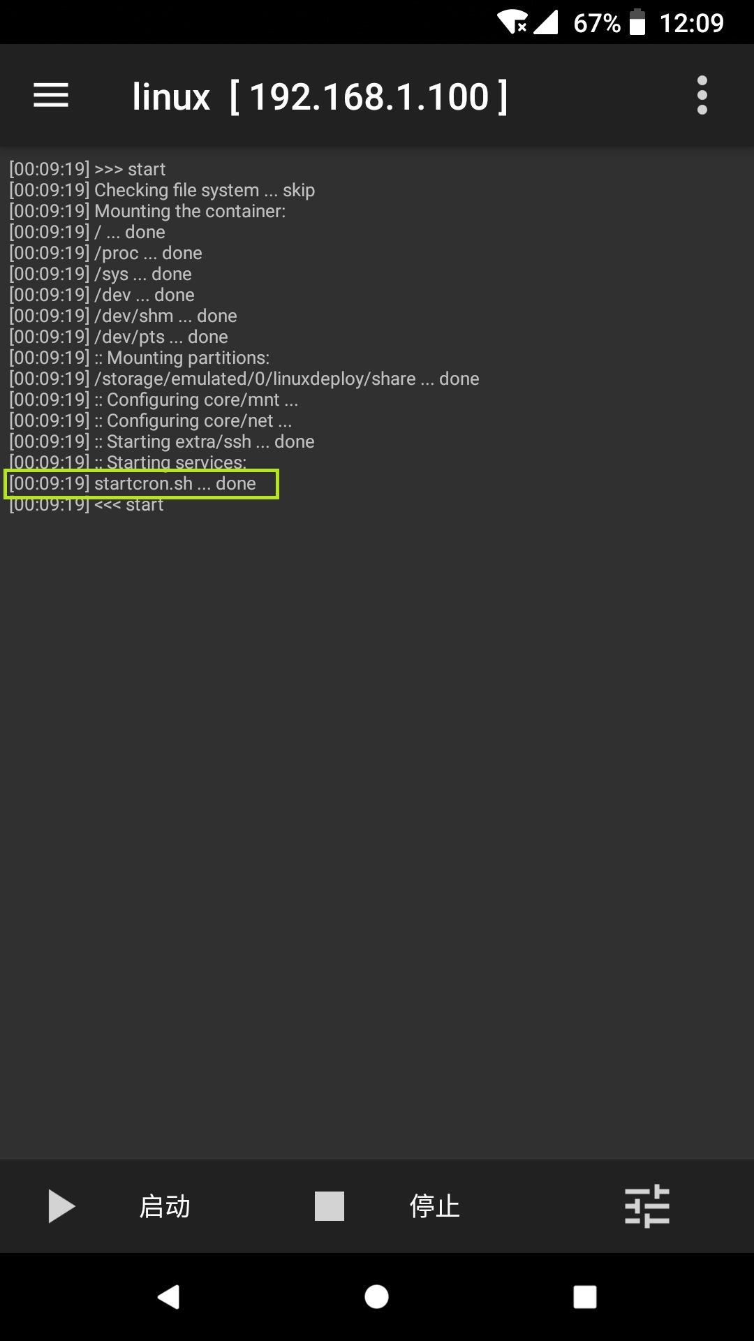勾选开机自动启动,这样linuxdeploy就能够伴随安卓系统启动,并且自动运行linux容器。