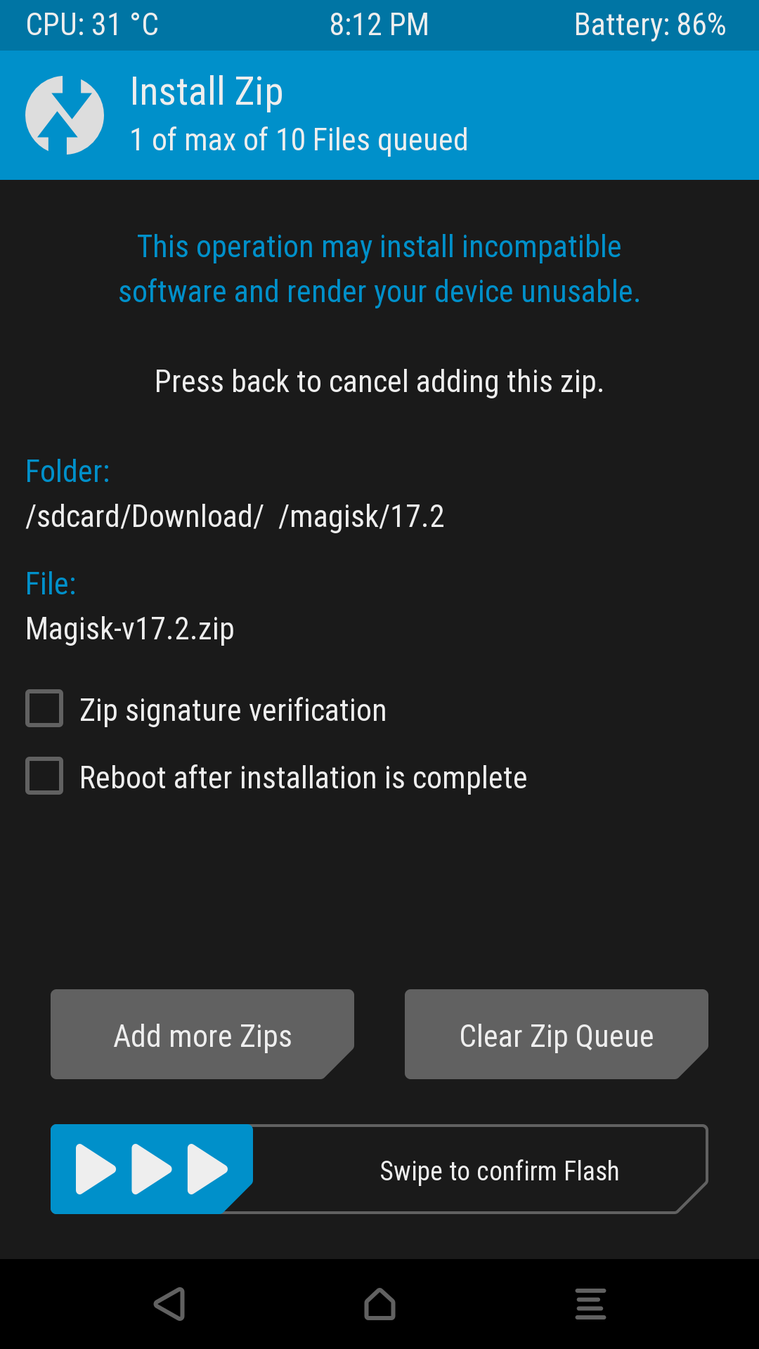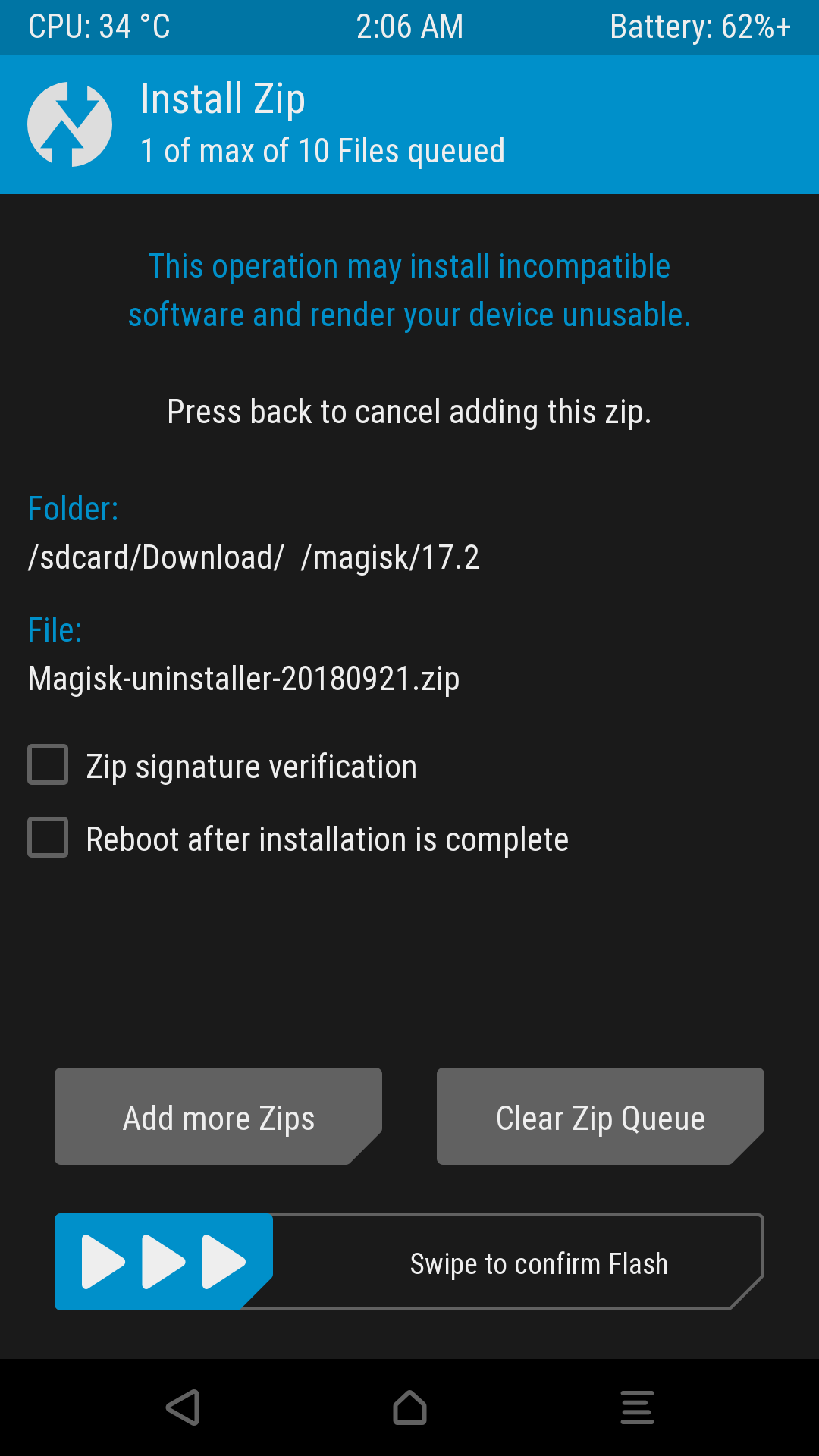 手机关机进入recovery,按照1.1的步骤刷入magisk版本对应的magisk-uninstaller卸载包(刷入文件选择magisk-uninstaller)