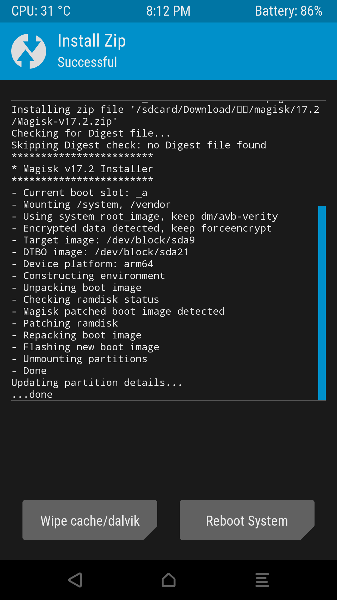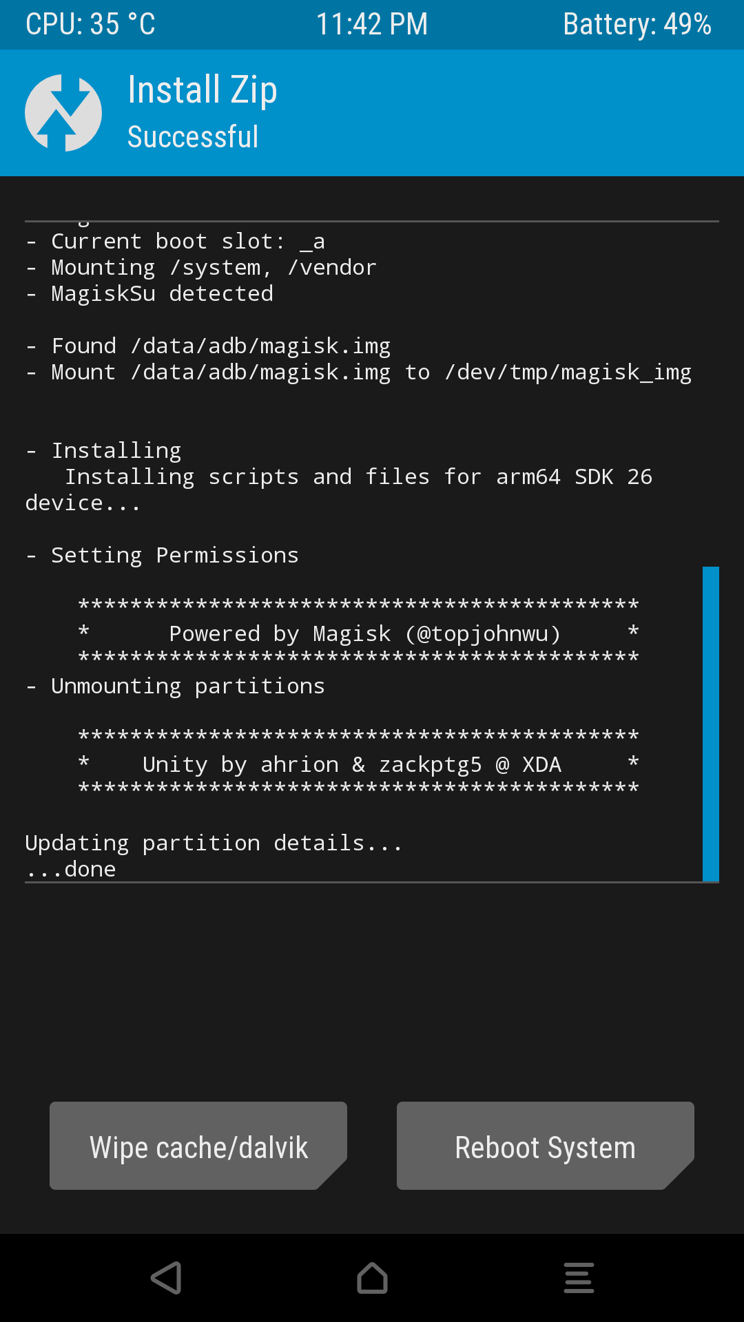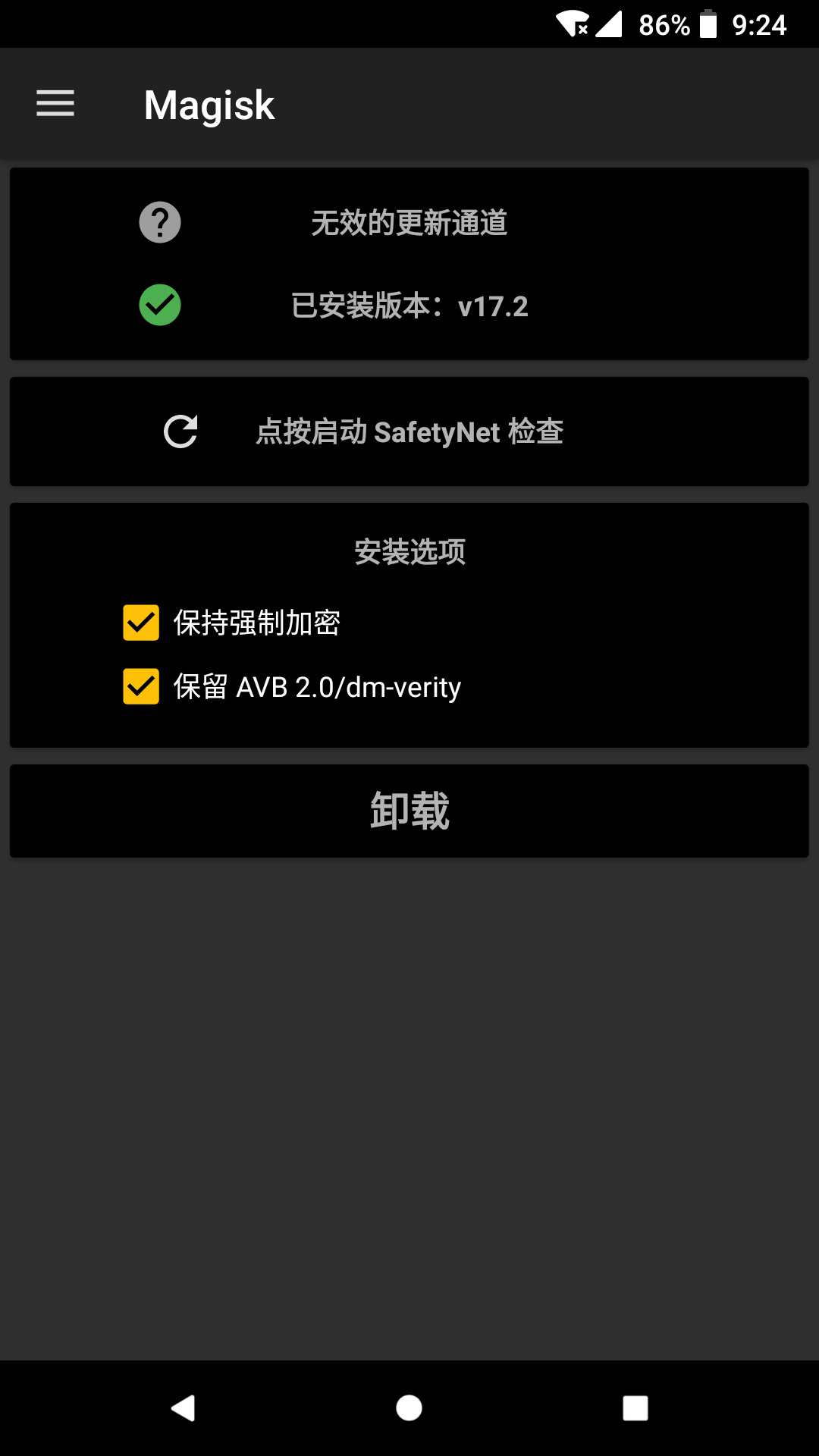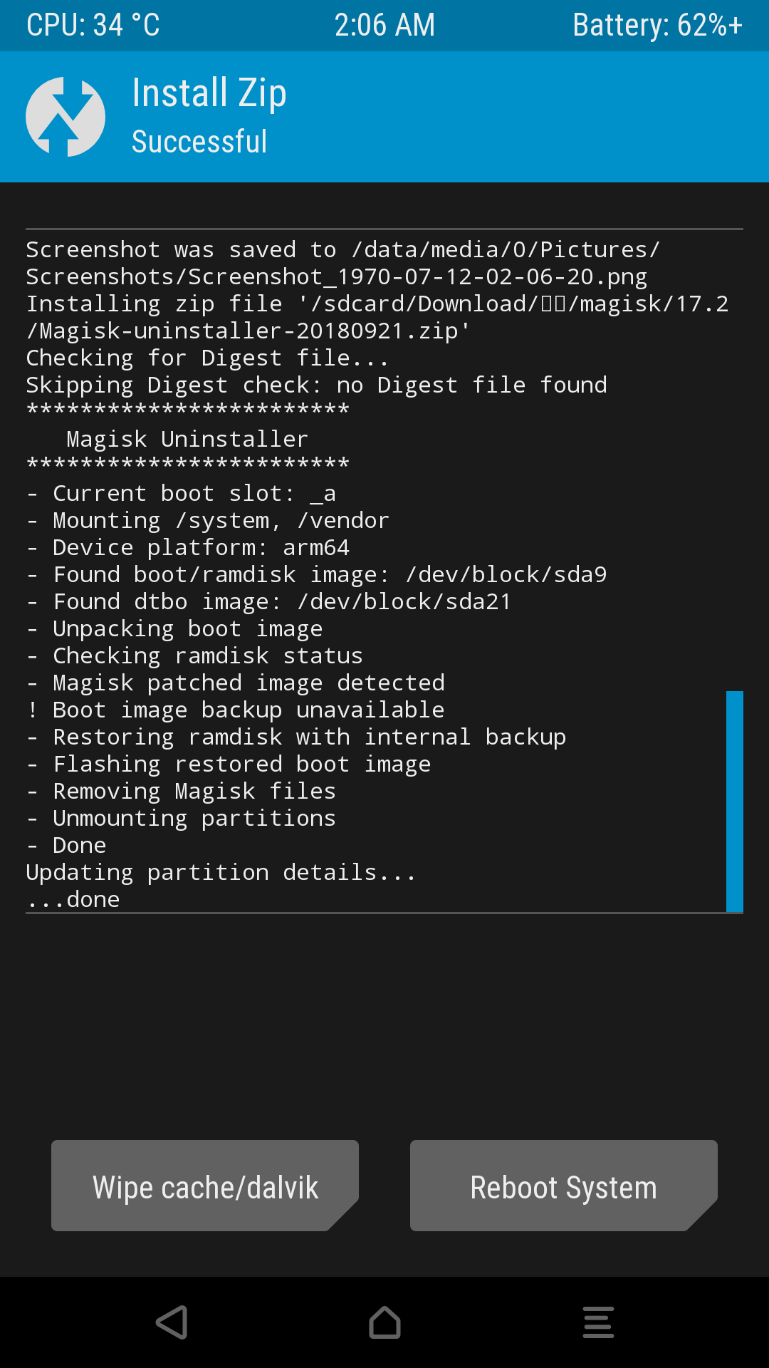 如果刷写后出现无法开机的情况,请关机进入recovery,按照之前的步骤刷入下载的magisk-uninstaller包解除安装即可。