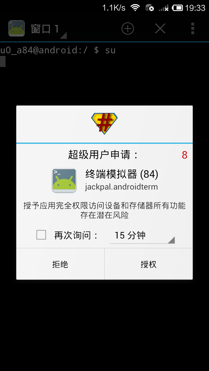 3.打开终端模拟器,输入以下命令提升权限,弹出超级用户授权窗口,点击授权