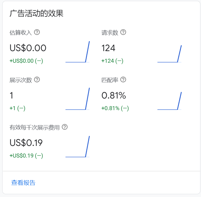 可以在admob中查看数据,请求了124次,而只有一次展示了广告,因为国内admob广告较少的缘故