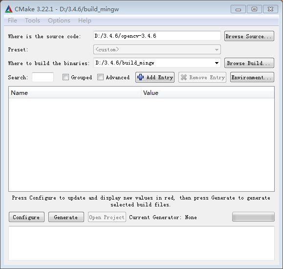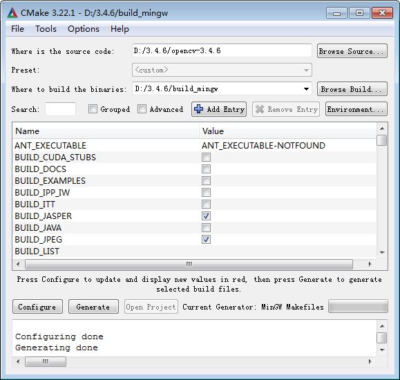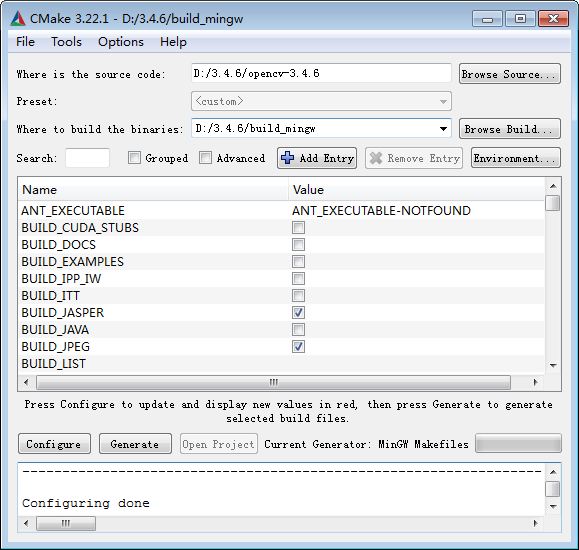 在where to build the binaries后面填入之前建立的build_mingw文件夹