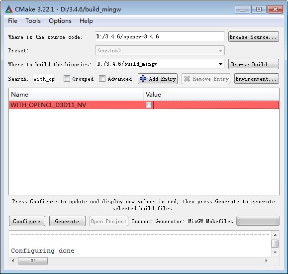 清空搜索框,输入WITH_OPENCL_D3D11_NV,找到WITH_OPENCL_D3D11_NV项,如果不需要d3d功能,将其取消勾选,否则编译时有可能出错