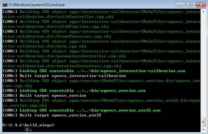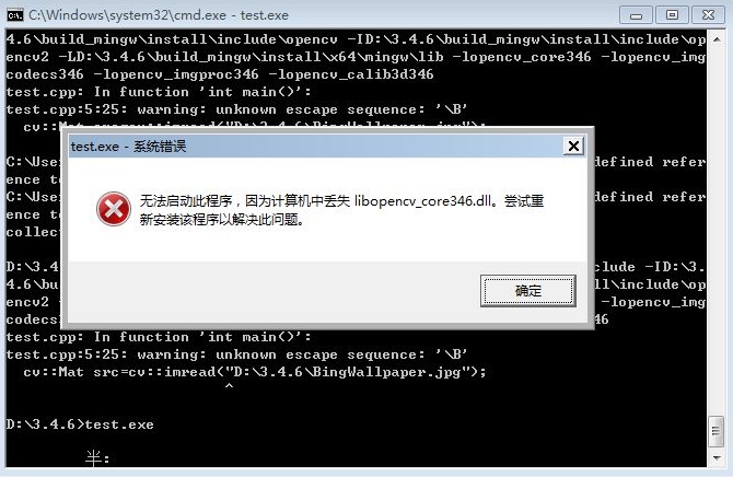 g++ test.cpp -o test.exe -ID:\3.4.6\build_mingw\install\include -ID:\3.4.6\build_mingw\install\include\opencv -ID:\3.4.6\build_mingw\install\include\opencv2 -LD:\3.4.6\build_mingw\install\x64\mingw\lib -lopencv_core346 -lopencv_imgcodecs346 -lopencv_imgproc346 -lopencv_calib3d346 -lopencv_highgui346