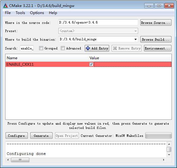 在Search搜索框里面输入ENABLE_CXX11,找到ENABLE_CXX11项,勾选,启用c++11新特性,否则之后编译会出错