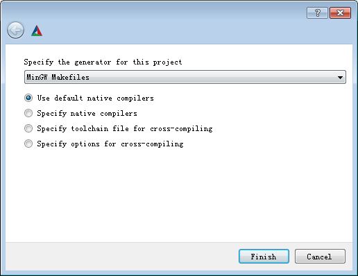 点击左下角configure,弹出对话框,选择MinGw Makefiles和Use default native compilers,点击Finish