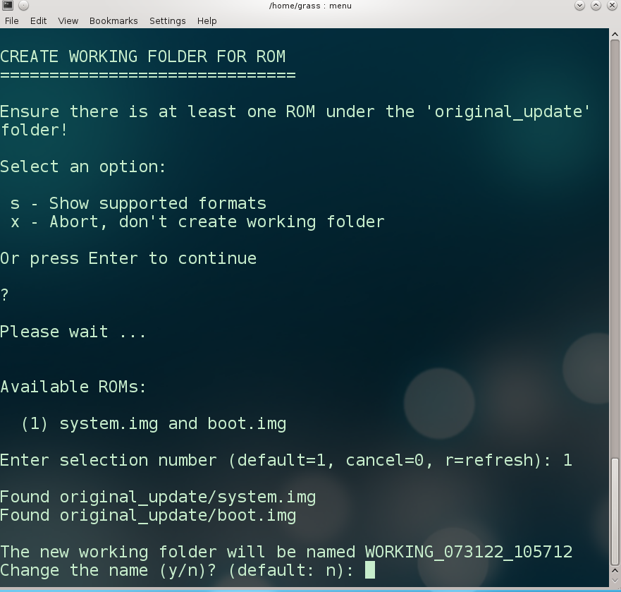 询问其它选项,输入回车掠过,之后系统检测到可用的rom(system.ing和boot.img),输入1选择,回车,询问是否改工作目录名字,输入回车忽略