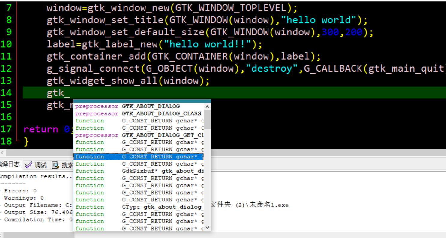 确保你的编译器版本位数和gtk库位数一样,推荐都是下载32位的,否则在链接阶段会无法正常链接gtk库