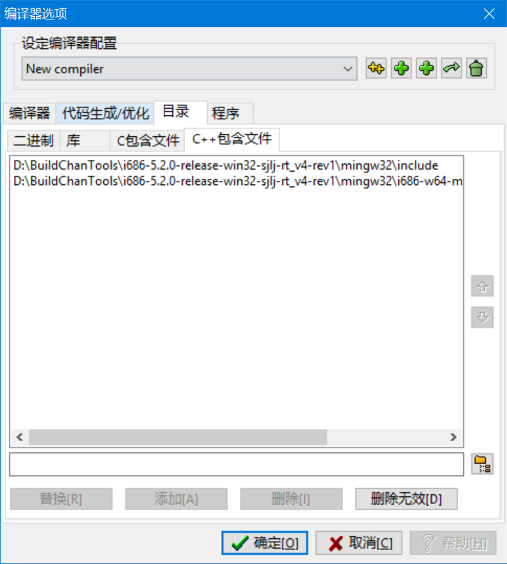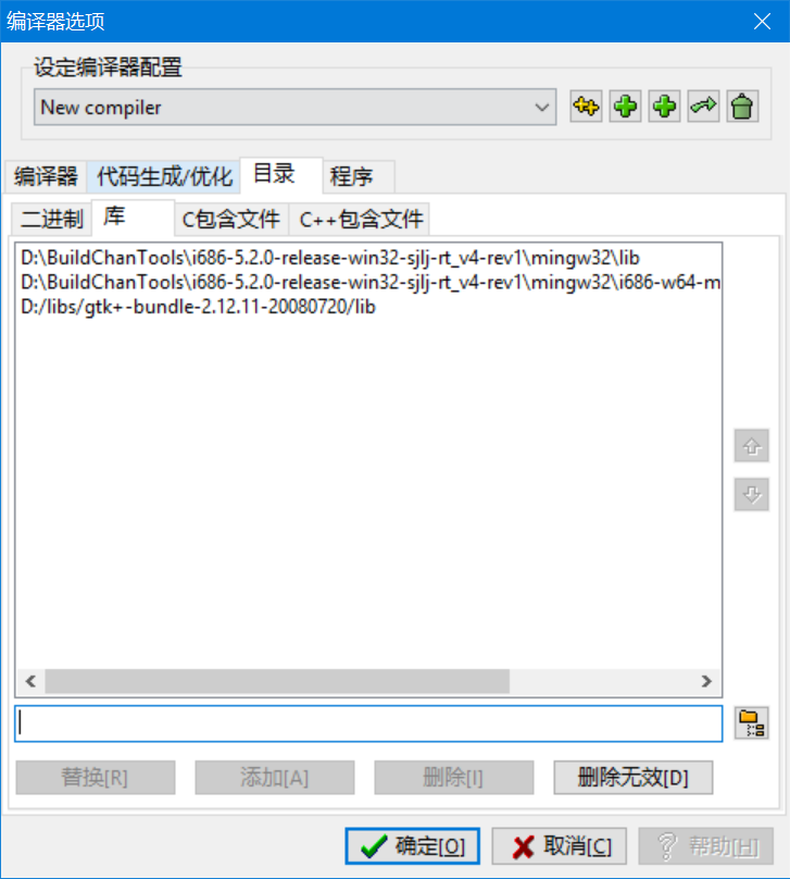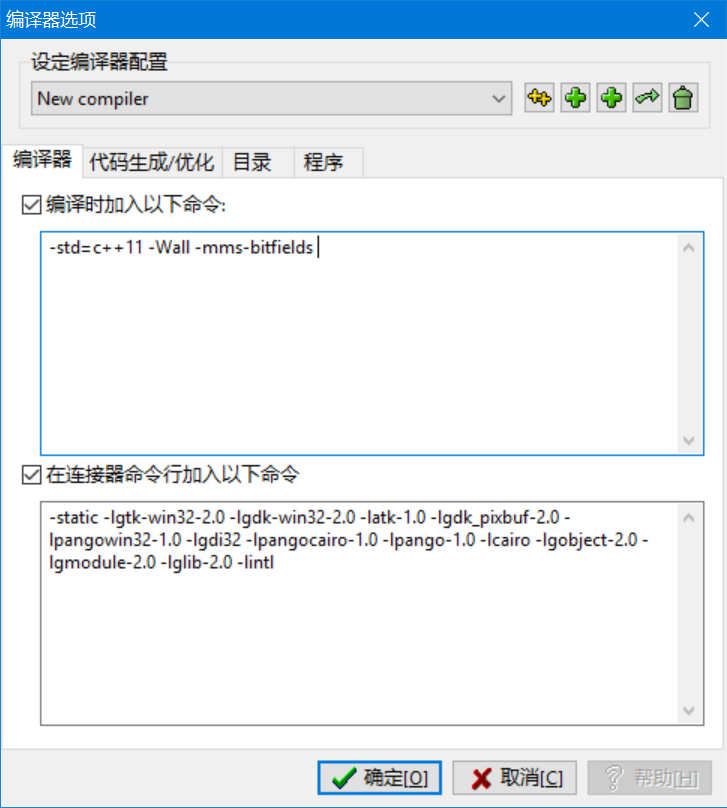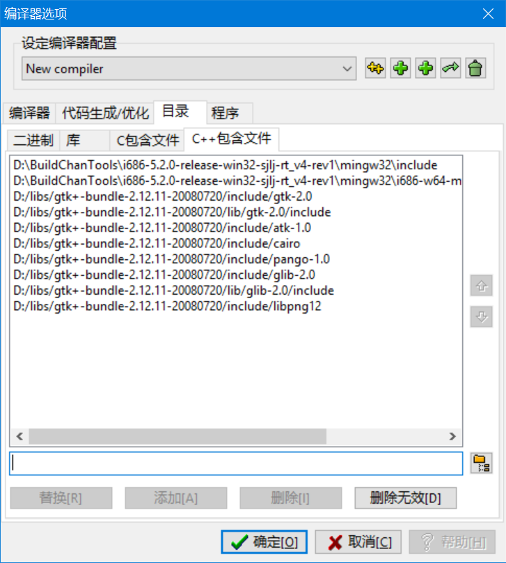 点击工具,编译选项,目录,c++包含文件,将之前配置gtk时pkgconfig输出的头文件目录全部的添加进去(-I开头的编译参数)