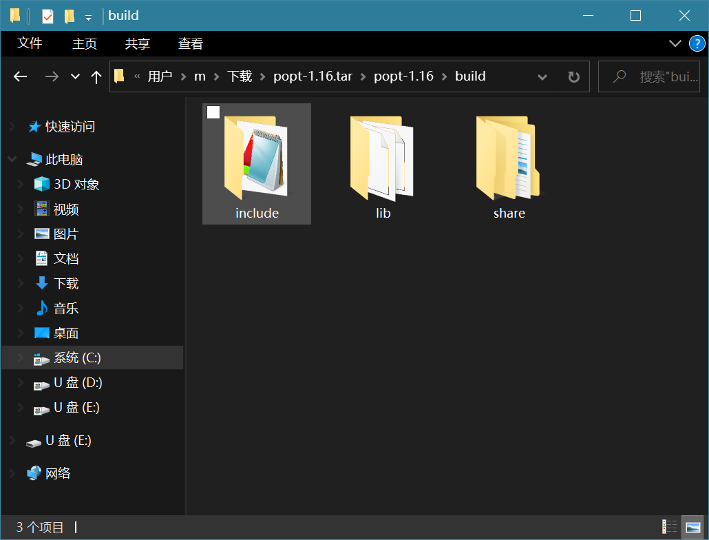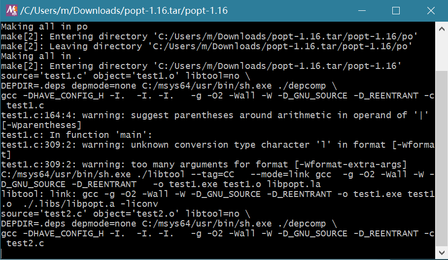 编译后的文件存在于prefix参数指定的文件夹内,也就是C:\Users\m\Downloads\popt-1.16.tar\popt-1.16\build