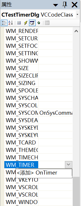 也可以自动覆写OnTimer函数,方法是,在类视图中,对CTestTimer类右键,属性,在属性页中,点击消息,找到WM_TIMER,点击添加OnTimer