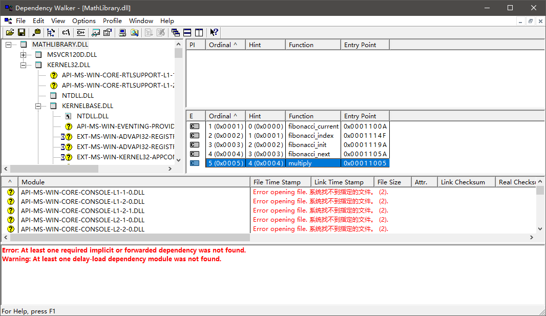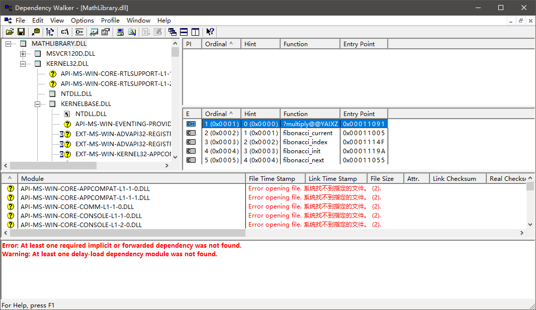 depends.exe查看dll,发现没有所需的符号在使用到动态库文件时,需要在声明函数为__declspec(dllimport)