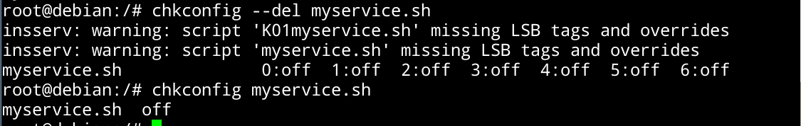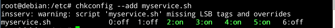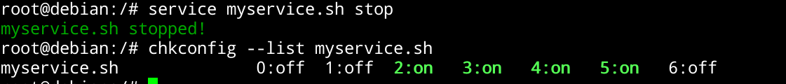之后发现在rc[2-5].d目录下,已经没有myservice.sh的软连接存在,并且服务状态也变成了off,不会伴随开机启动