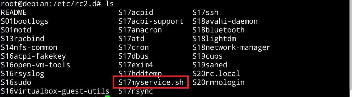 之后会发现,在rc[2-5].d目录下,多了名为S17myservice.sh的软连接。说明系统会在运行级别为2-5时,自动启动myservice.sh脚本,并且以start作为参数(S开头的脚本启动时start作为参数(start),K开头的脚本启动时以stop作为参数(kill))
