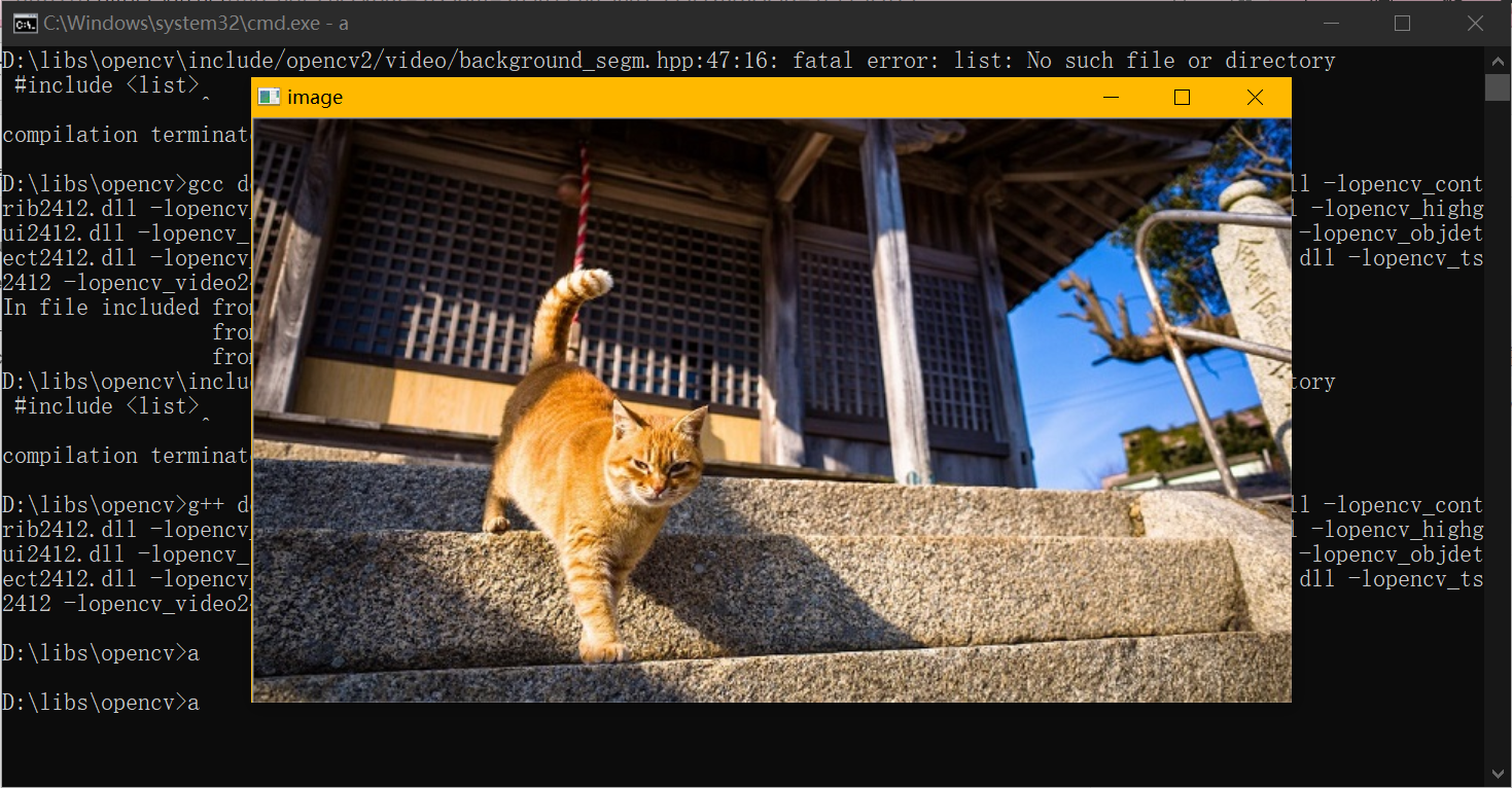 g++ demo.c -ID:\libs\opencv\include -LD:\libs\opencv\x86\mingw\lib -lopencv_calib3d2412.dll -lopencv_contrib2412.dll -lopencv_core2412.dll -lopencv_features2d2412.dll -lopencv_flann2412.dll -lopencv_gpu2412.dll -lopencv_highgui2412.dll -lopencv_imgproc2412.dll -lopencv_legacy2412.dll -lopencv_ml2412.dll -lopencv_nonfree2412.dll -lopencv_objdetect2412.dll -lopencv_ocl2412.dll -lopencv_photo2412.dll -lopencv_stitching2412.dll -lopencv_superres2412.dll -lopencv_ts2412 -lopencv_video2412.dll -lopencv_videostab2412.dll