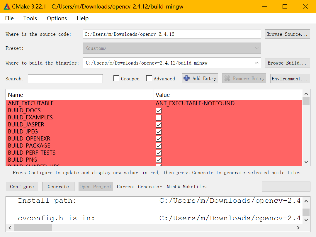 之后再次点击configure,完成后红色背景消失了,点击generate产生makefile文件