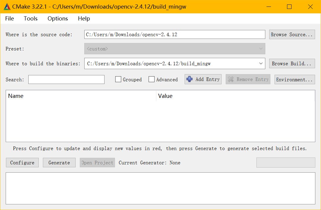 2.到cmake的bin目录下,打开cmake-gui.exe,where is the source code填如opencv源码目录,where to build the binaries填如build_mingw目录