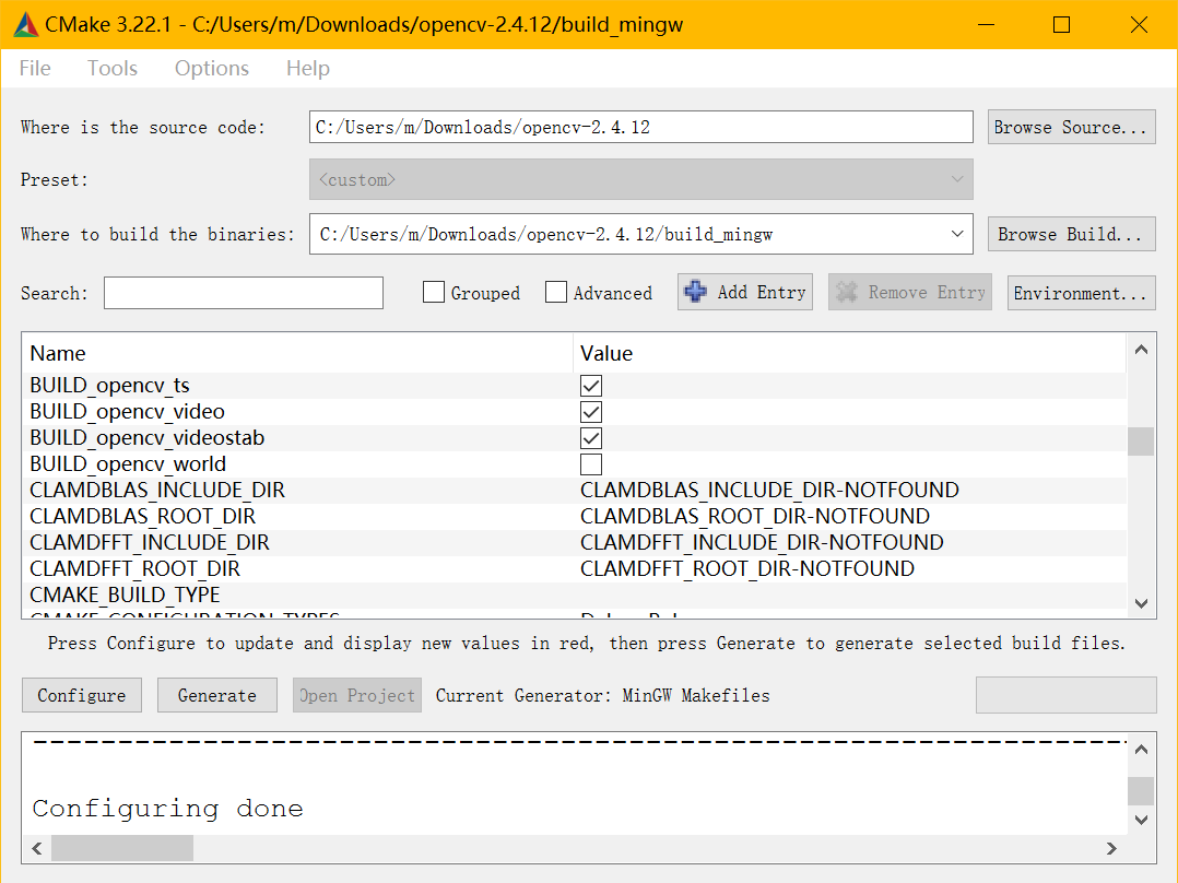 configure完成,可以在列表中配置编译参数,如BUILD_opencv_world,是将原本多个库文件合并生成一个库文件,方便编译配置和使用