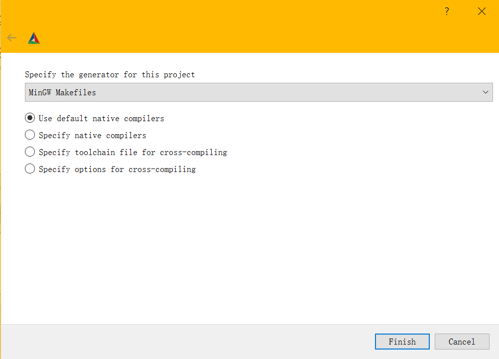 点击configure,选择mingw makefiles,use default native compilers,finish