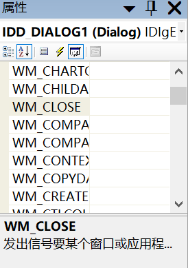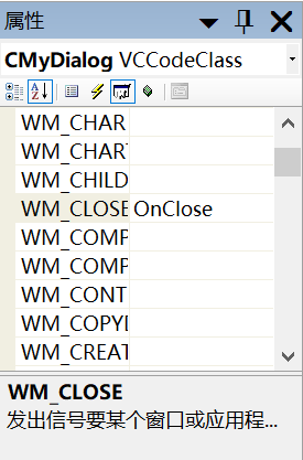 之后在窗体的属性,消息列表中,可以看到消息类型,直接点击WM_CLOSE,添加事件响应程序