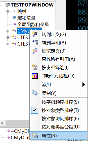 而对于事件响应的添加,在类视图中右键,属性