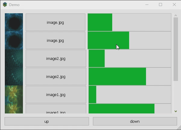 下面的例子是实现一个显示图片、按钮和进度条的列表,并且进行上移下移,具有添加和删除列表项功能但没有演示