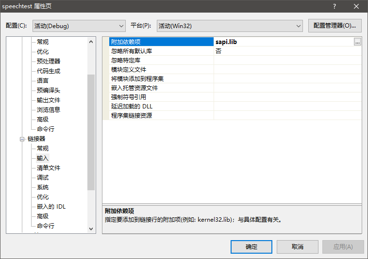 链接器,输入,附加依赖项,添加sapi.lib