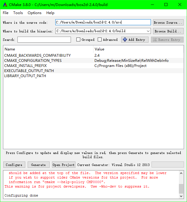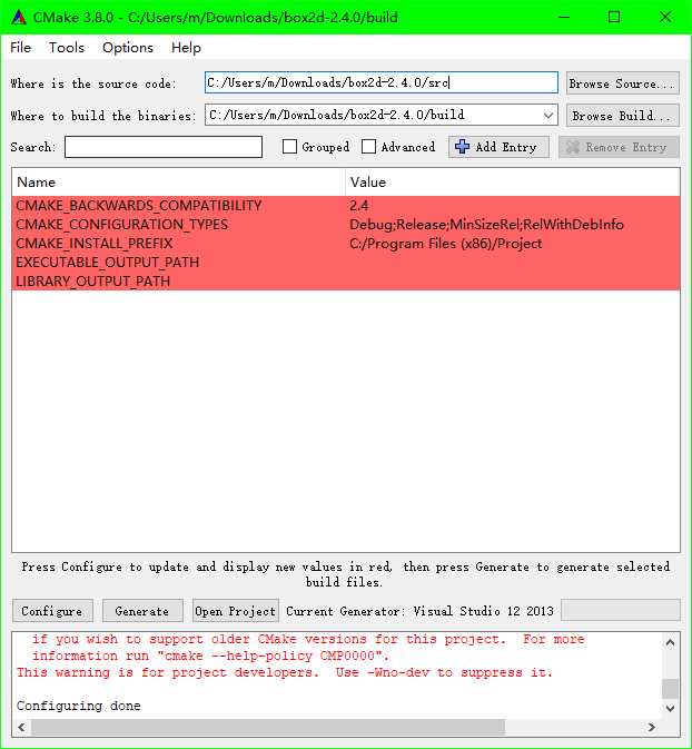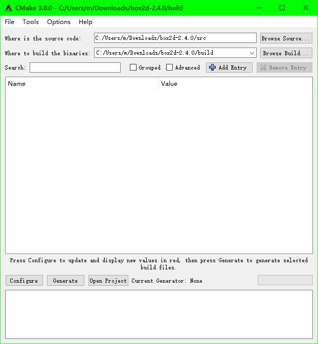 安装cmake,打开cmake-gui,设置源码目录box2d-2.4.0/src,编译目录box2d-2.4.0/build,点击configure