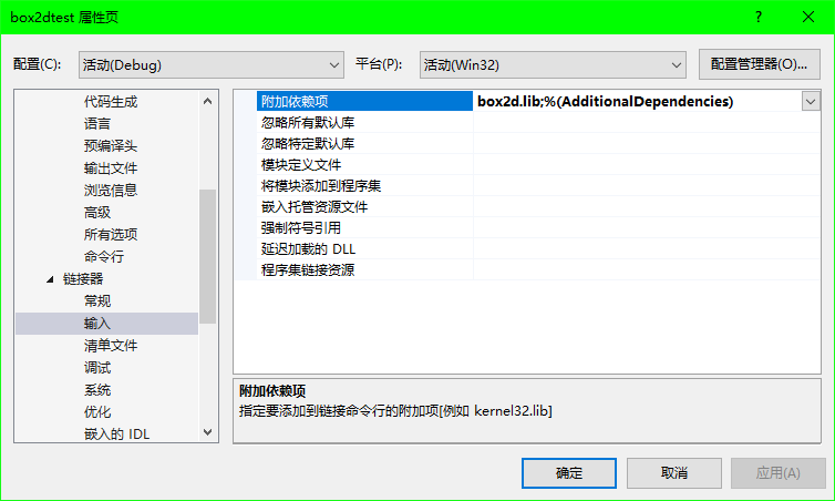 链接器,输入,附加依赖项,添加box2d.lib