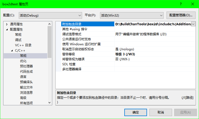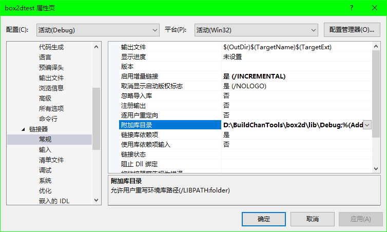 链接器,常规,附加库目录,设置box2d.lib文件目录