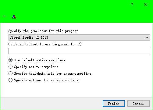 选择VS12 2013,Use default native compilers,点击Finish