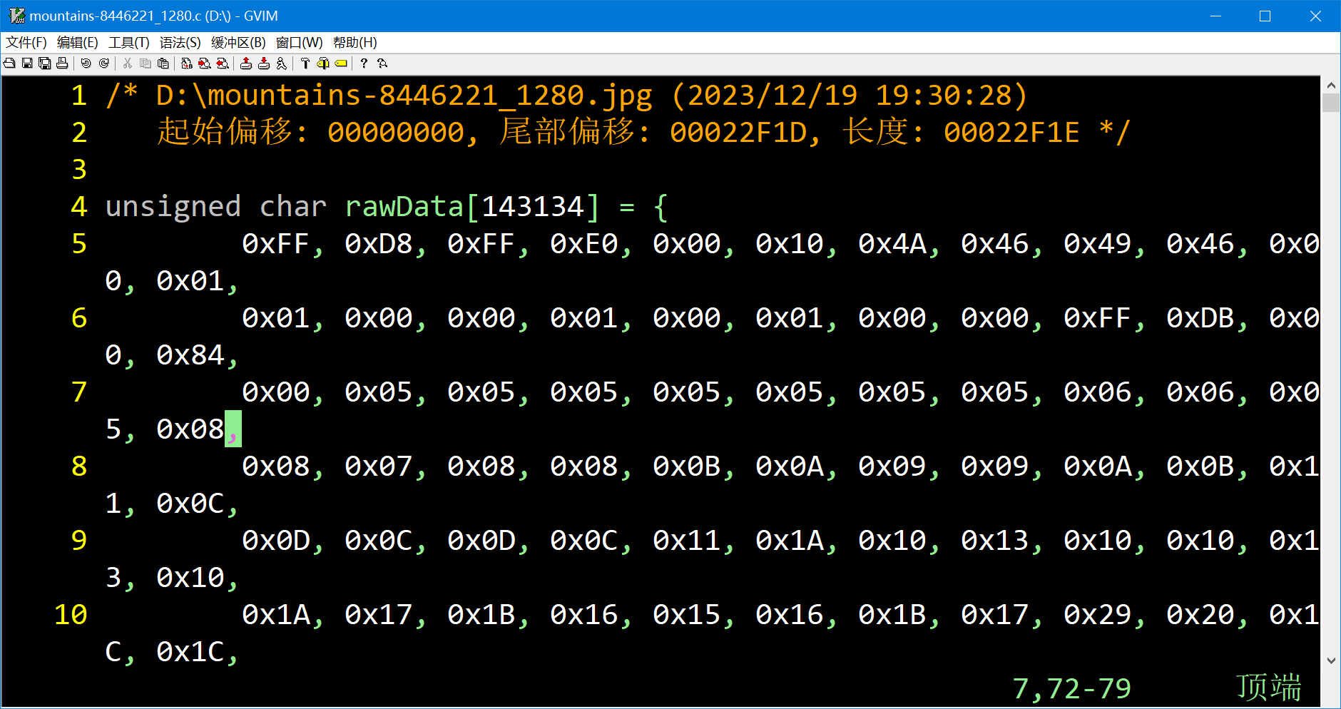 查看导出的c语言文件,定义了一个rawData变量,里面储存的是图片的16进制数据