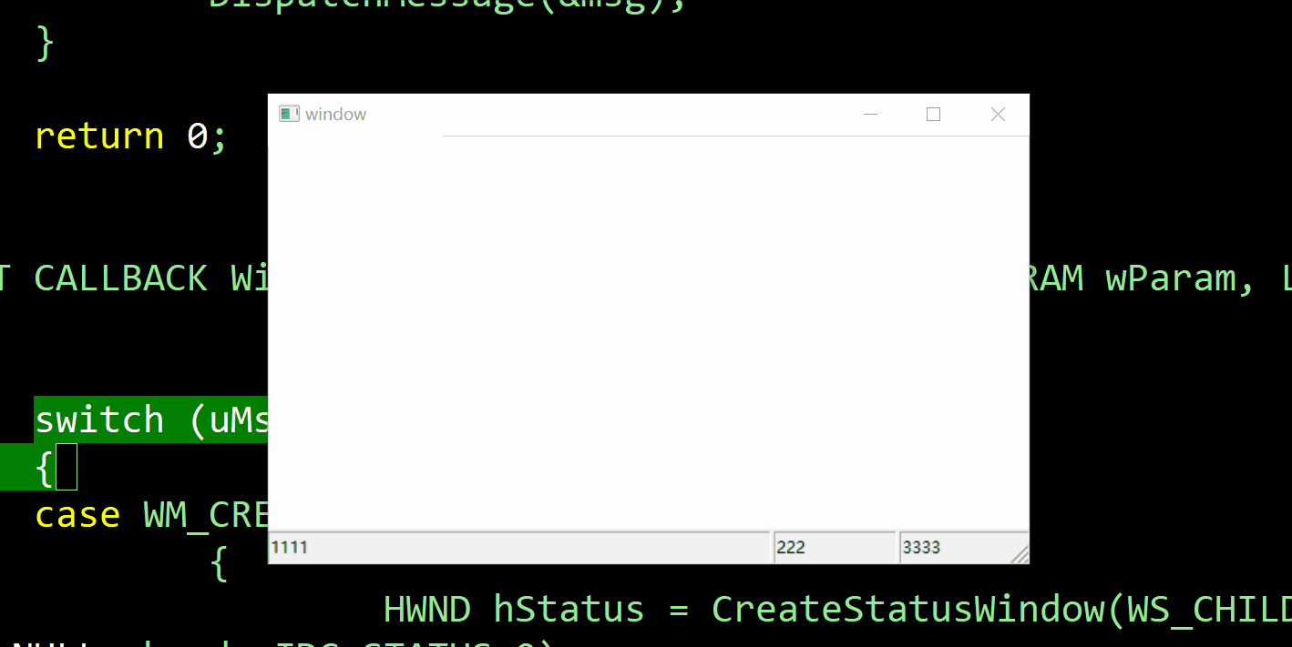 使用CreateStatusWindow创建一个状态窗口,该窗口通常用于显示应用程序的状态。 该窗口通常显示在父窗口底部,其中包含指定的文本。