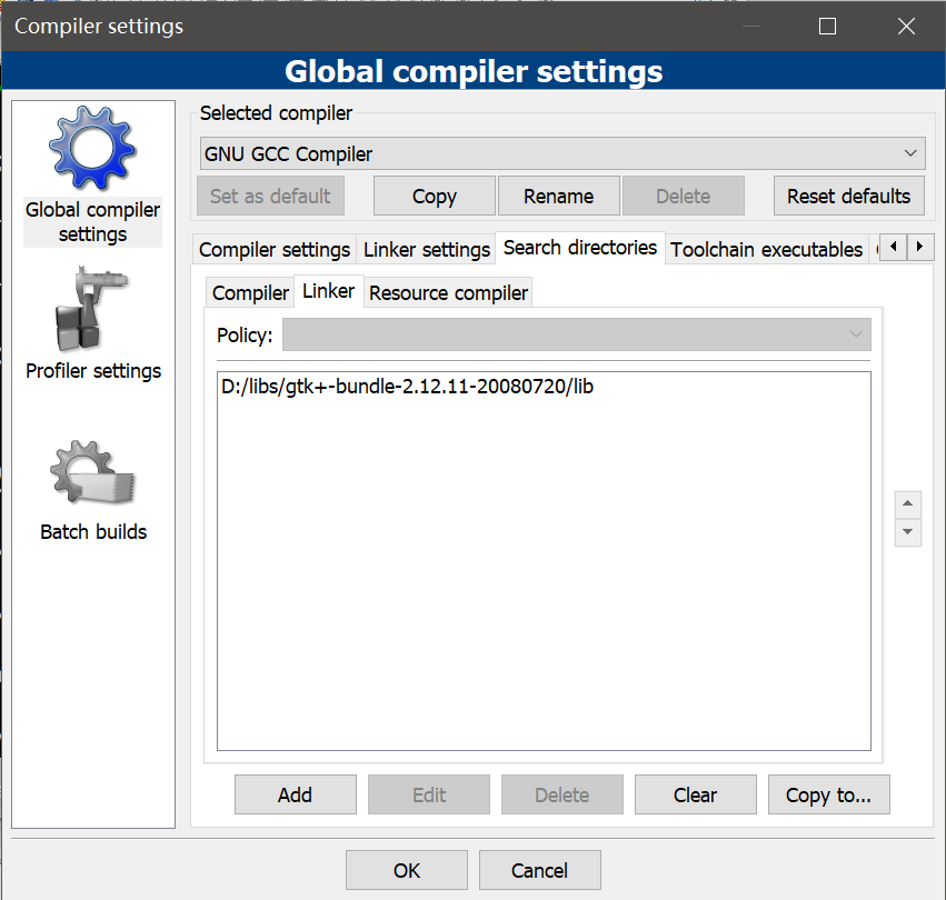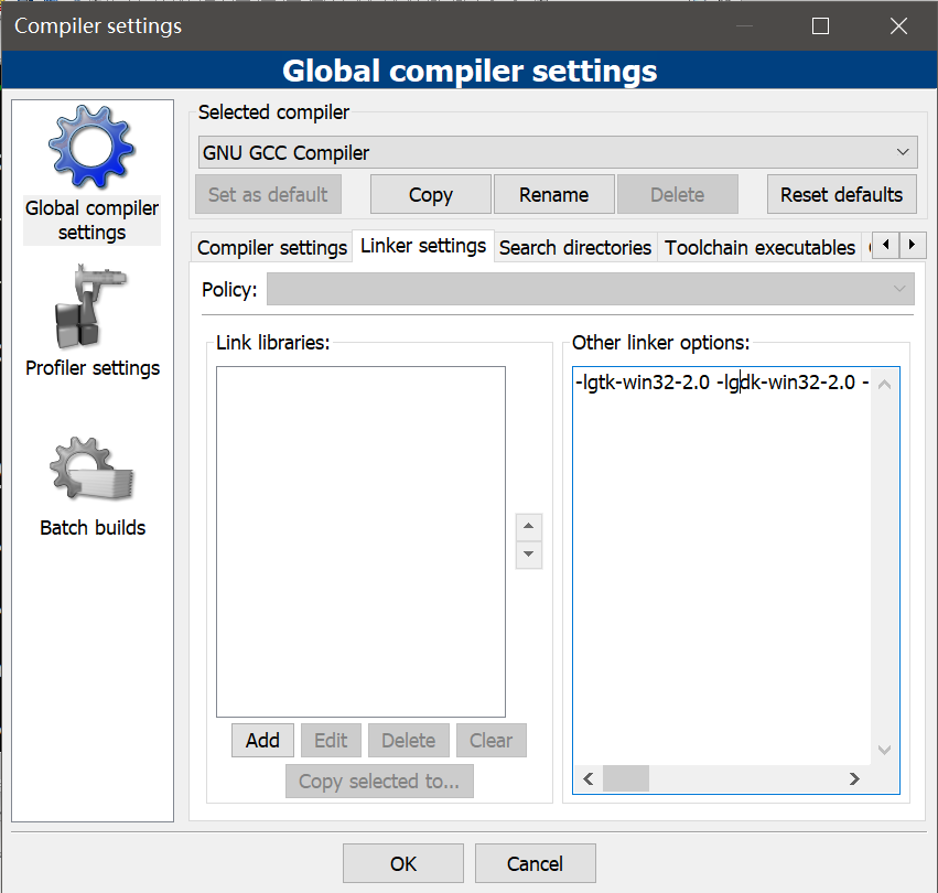 - Linker settings ,链接器设置,加入链接所需的gtk库,你可以通过add一个一个的将链接库加入link libraries,但是不如直接加链接参数指定链接库方便