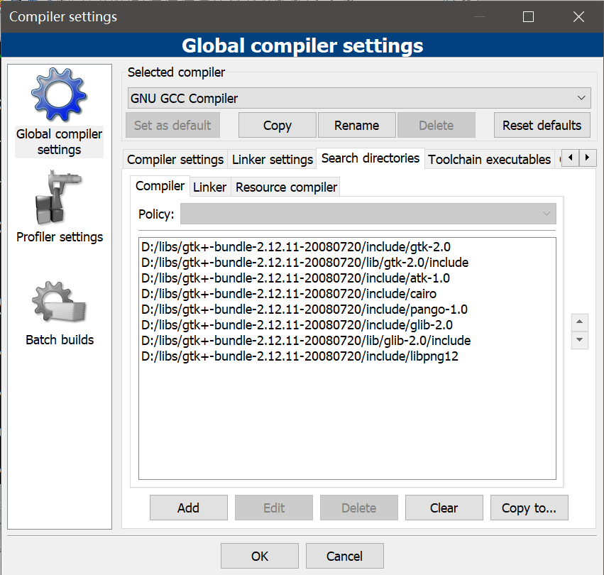 4.打开codeblock,settings,compiler,global compiler settings,search directories,compiler,设置附加头文件搜索目录