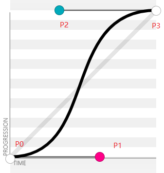 三次贝塞尔曲线需要四个点来定义,P0 、P1 、P2、P3。P0、P1、P2、P3 四个点在平面或在三维空间中定义了三次方贝塞尔曲线。曲线起始于 P0 走向 P1,并从 P2 的方向来到 P3。一般不会经过 P1 或 P2;这两个点只是在那里提供方向资讯。