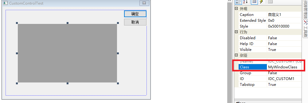 在资源视图中,选择自定义控件,属性,杂项,设置Class为注册的窗体名字"MyWindowClass"