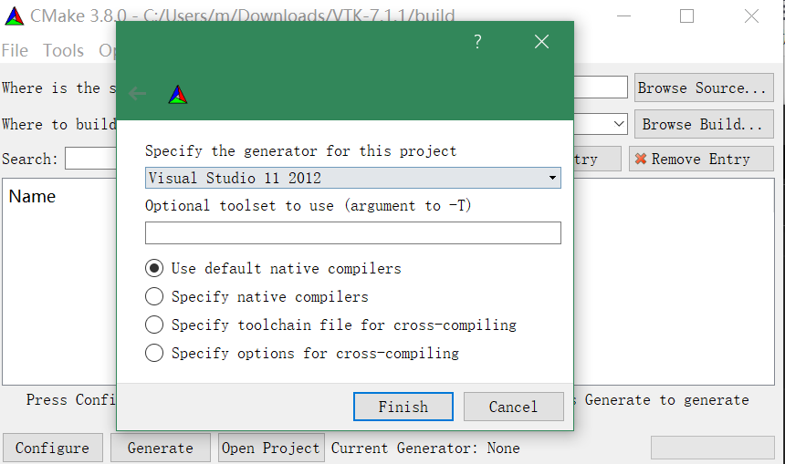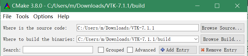 安装好cmake,打开cmake-gui,在where is the source code 后面填入vtk解压后的源码目录。where to build the binaries后面是自己指定的编译目录。之后点击configure。