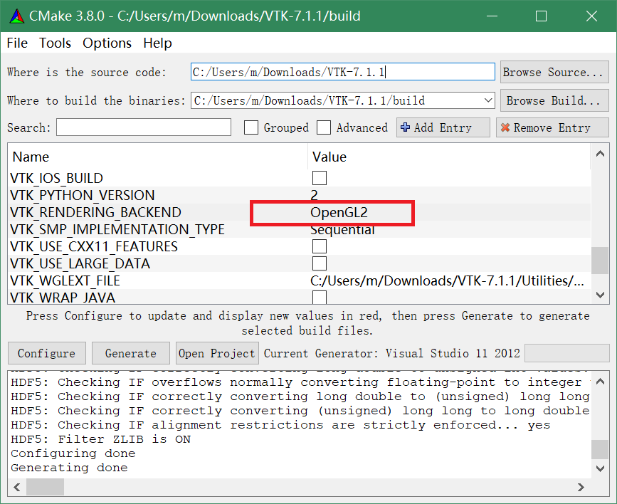 再次点击configure,configure完成后,点击generate,在编译目录下生成vs2012项目
