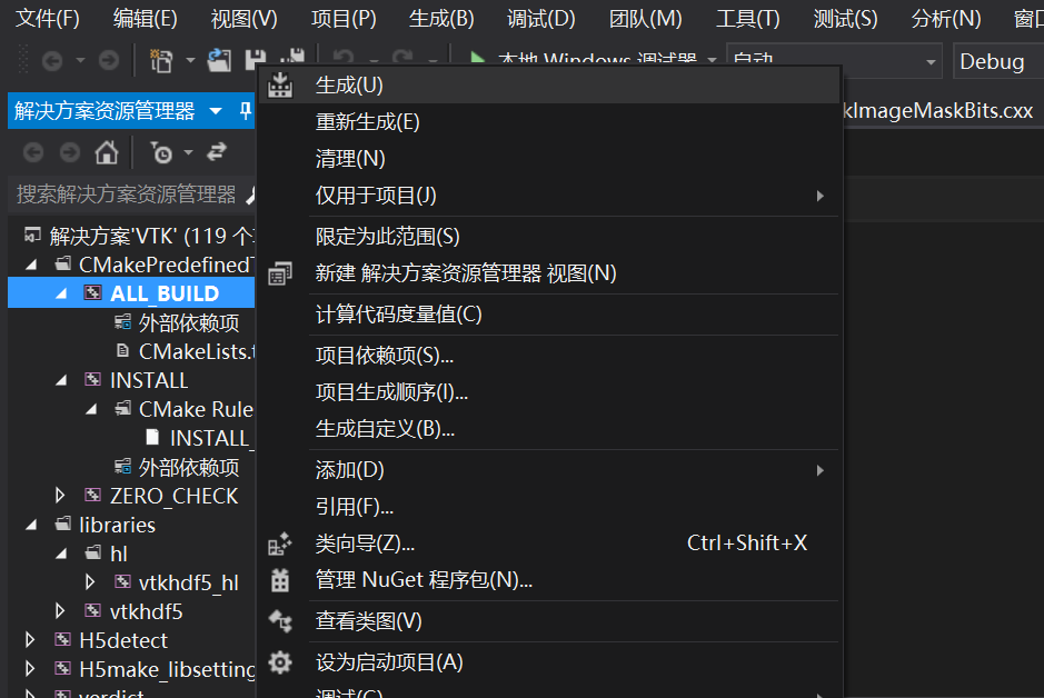 对于ALL_BUILD项目,右键,生成。等待十几分钟编译时间