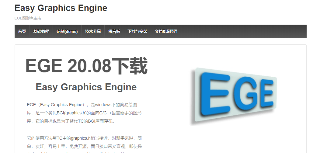 EGE(Easy Graphics Engine),是windows下的简易绘图库,是一个类似BGI(graphics.h)的面向C/C++语言新手的图形库,它的目标也是为了替代TC的BGI库而存在。