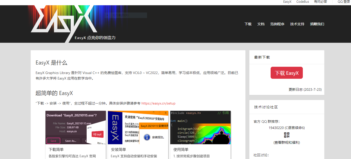 EasyX Graphics Library 是针对 Visual C++ 的免费绘图库,支持 VC6.0 ~ VC2022,简单易用,学习成本极低,应用领域广泛。目前已有许多大学将 EasyX 应用在教学当中。