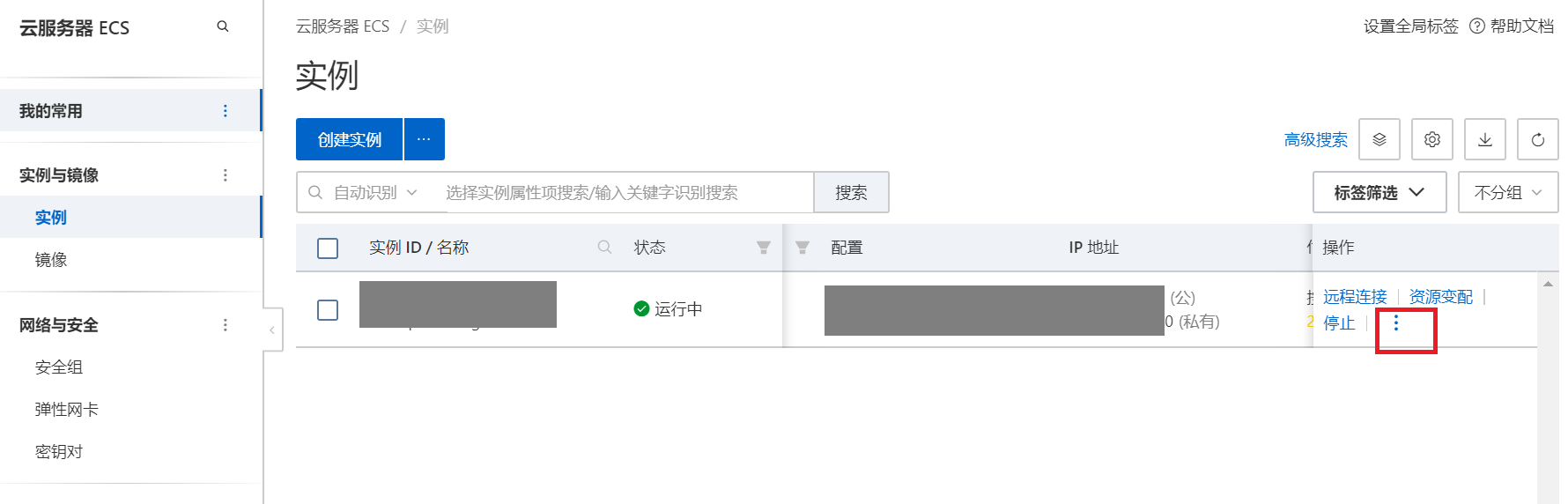 购买完成进入控制台,能看到创建的实例。公网和私有ip地址。点三个点。