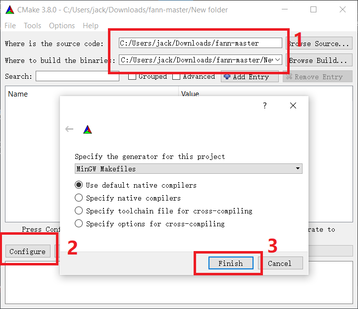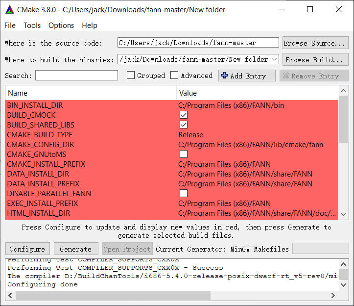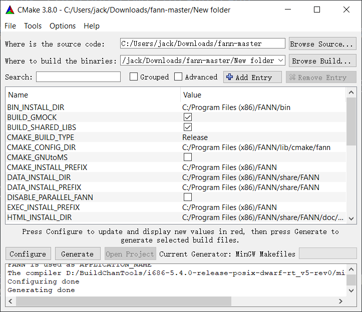 打开cmake,定位到FANN源码目录,填写输出目录。点击configure,选择自己编译系统需要的makefile类型,点finish。