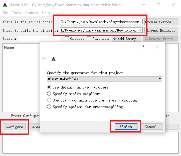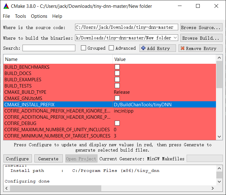 解压tiny-dnn的源码,打开cmake-gui,选择源码目录,设置1个输出目录。点击configure,选择本地的编译系统的项目文件。对于mingw就选mingw makefile
