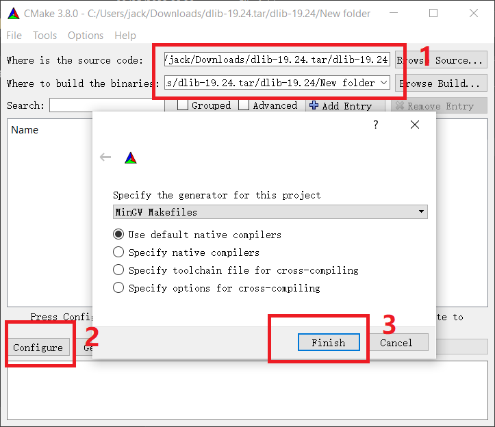 打开cmake-gui,选择源码目录和设置输出目录,点击configure,选择编译系统的makefile文件类型。点击finish