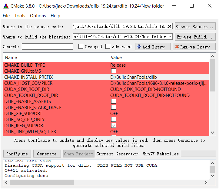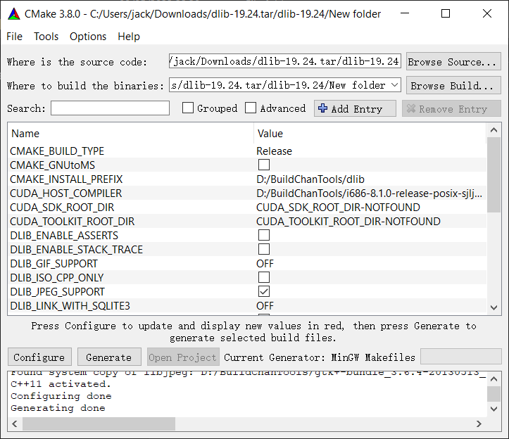 设置好后再次点击configure,恢复正常颜色,点击generate生成makefile文件