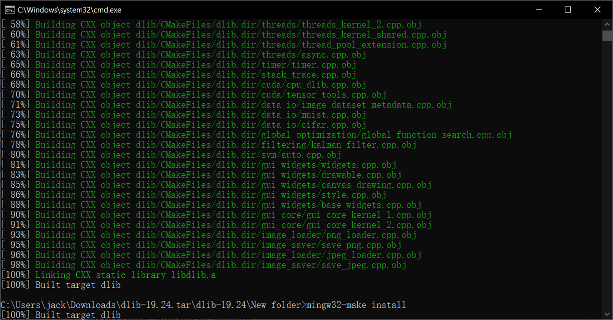 g++ main.cpp -o main.exe -ID:\BuildTools\dlib\include -LD:\BuildTools\dlib\lib -ldlib