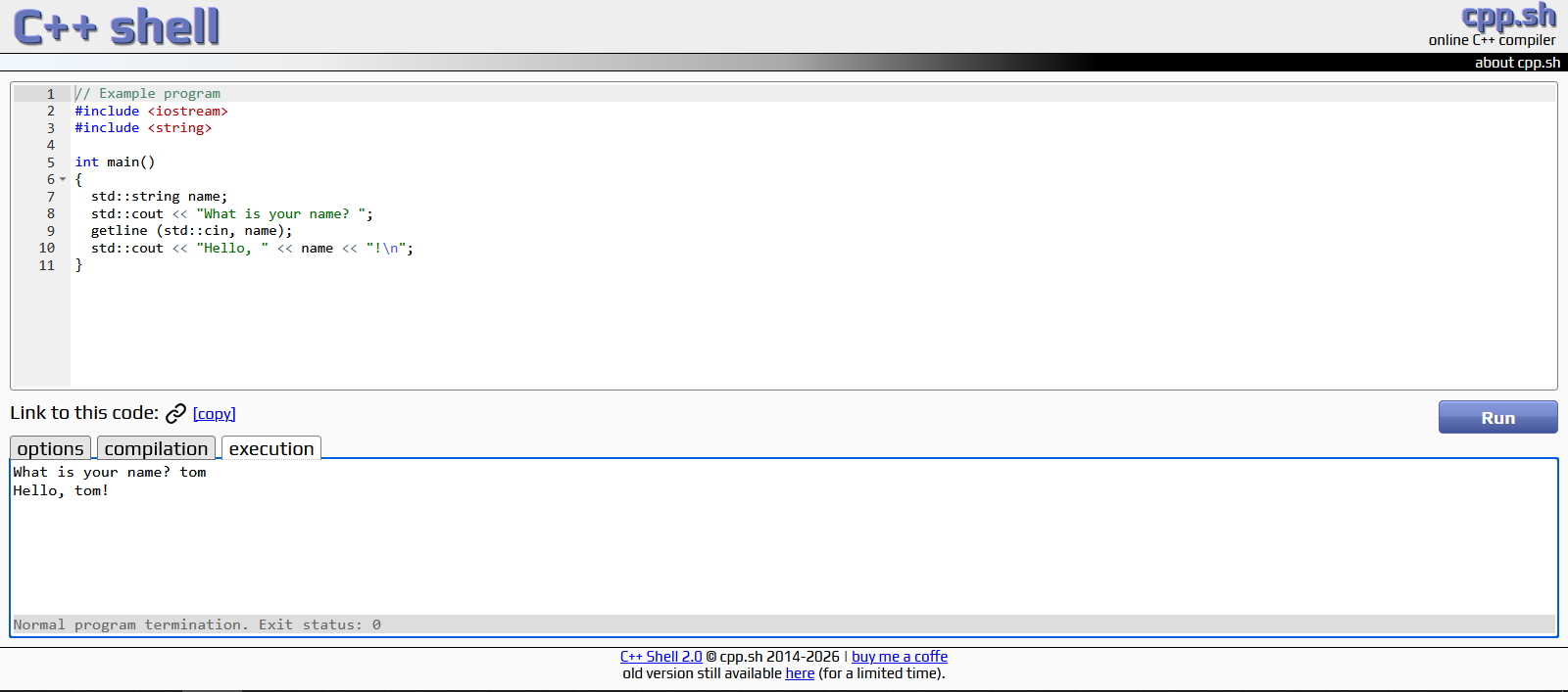 c++ shell是一个简洁的在线C++代码编译和运行工具。无需安装任何软件,直接在网页内编写、编译和运行C++代码。可以方便地输入程序所需数据,并直接查看输出结果。